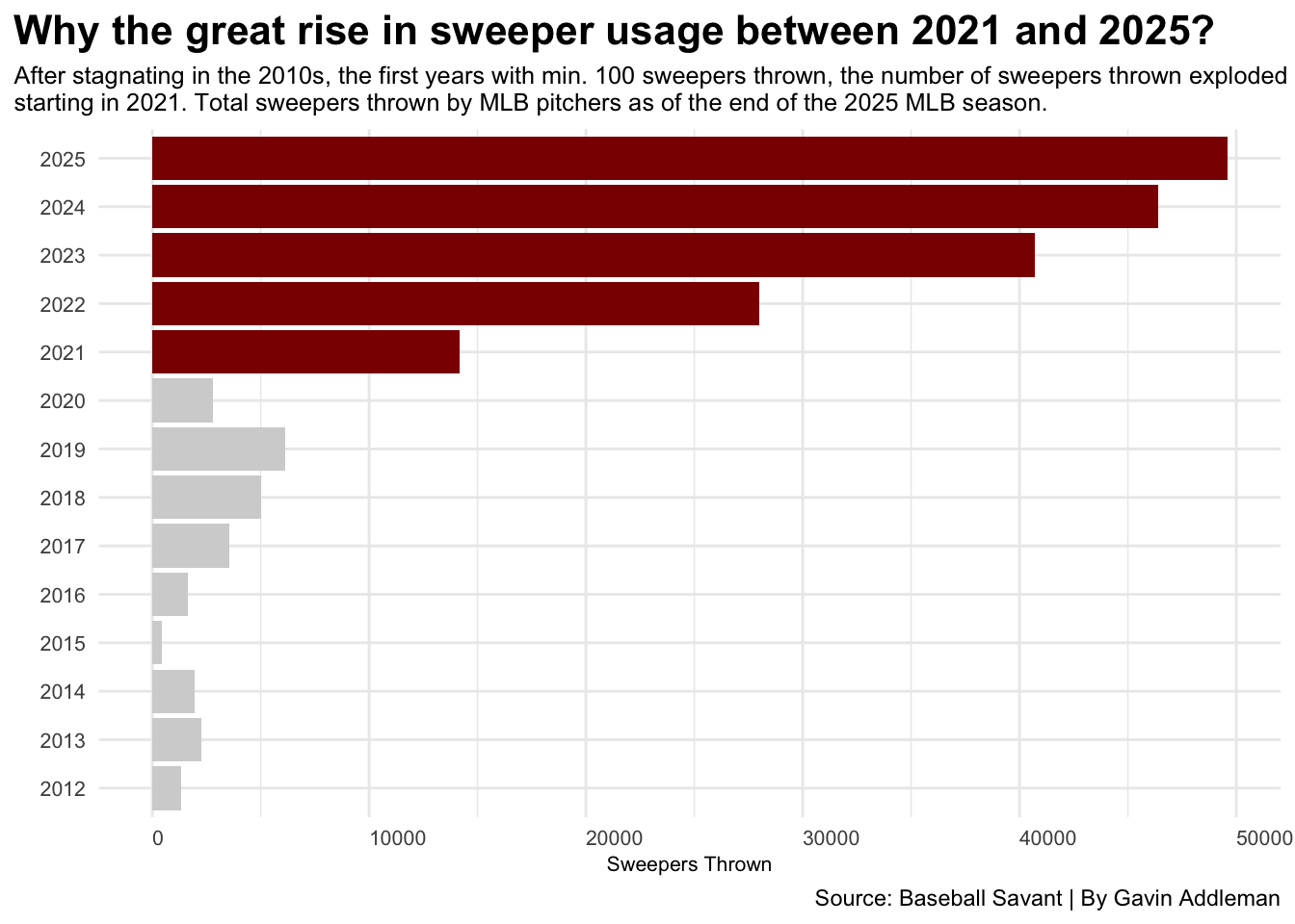 Let’s first look at the history of the sweeper through Baseball Savant’s data on every sweeper thrown in MLB regular season games since 2012, the first year pitchers threw at least 100 total sweepers per pitcher.