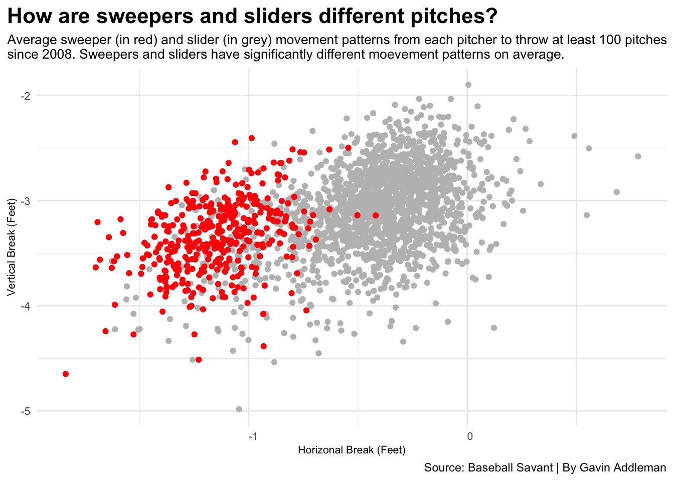 ggplot() +geom_point(data=tot_slider, aes(x=api_break_x_arm, y=-api_break_z_with_gravity), color="grey") +geom_point(data=tot_sweeper, aes(x=api_break_x_arm, y=-api_break_z_with_gravity), color="red") +labs(x ="Horizonal Break (Feet)",y ="Vertical Break (Feet)",title="How are sweepers and sliders different pitches?", subtitle="Average sweeper (in red) and slider (in grey) movement patterns from each pitcher to throw at least 100 pitches\nsince 2008. Sweepers and sliders have significantly different moevement patterns on average.",caption="Source: Baseball Savant | By Gavin Addleman") +theme_minimal() +theme(plot.title =element_text(size =16, face ="bold"),axis.title =element_text(size =8),plot.subtitle =element_text(size =10),axis.text.y =element_text(size =8, hjust=.45),axis.text.x =element_text(size =8, hjust=0),plot.title.position ="plot" )